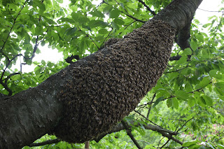 Ein schöner großer Bienenschwarm hat sich in Eckis Garten nahe an Eckis Imkerstand niedergelassen. Zudem sehr kooperativ: in Nasenhöhe.