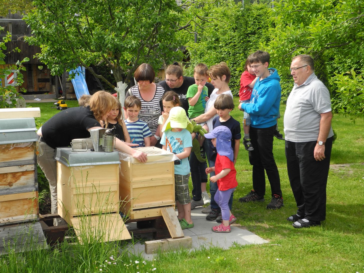 Das Mehrgenerationenprojekt der evangelischen Kirchengemeinde Einhausen war im Mai zu Besuch am Imkerstand von Stephan und Tatjana Spahl.