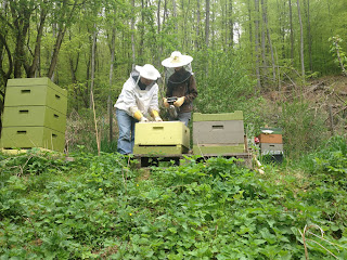 Foto unten: Arbeit mit dem Imkervater am Ableger.